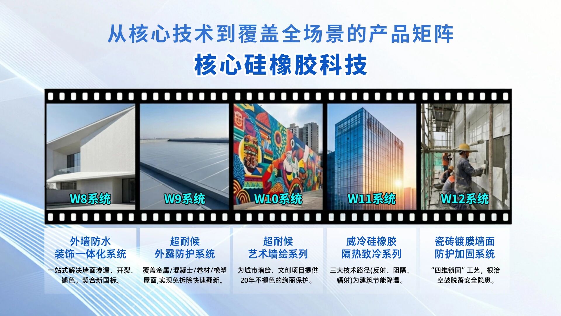 The Weldon W series products, relying on proprietary silicone rubber core technology, provide an integrated solution for building façades that encompasses 'long-lasting waterproofing + durable protection + aesthetic enhancement.' The highly elastic and dense waterproof layer completely blocks rainwater penetration, addressing leakage problems from the source; excellent weather resistance and strong anticorrosion ability resist UV rays, acid rain, and aging, keeping the building's 'exterior coat' looking new over time; the dense, stain-resistant surface preserves color freshness, achieving both functional and aesthetic upgrades. It provides solid support for urban renewal, keeping building façades lasting like new, safe, and reliable.